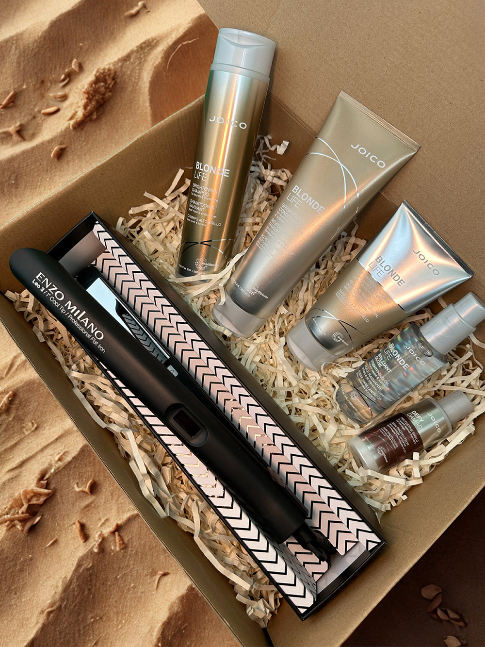 Incluye: JOICO Blonde Life Brightening Shampoo 300 ml, JOICO Blonde Life Brightening Conditioner 250 ml, JOICO Blonde Life Brightening Masque 150 ml, JOICO Blonde Life Brightening Oil 100 ml y JOICO Defy Damage Protective Shield 50 ml. y 1 Plancha Profesional Enzo Milano a elección (5 modelos disponibles).